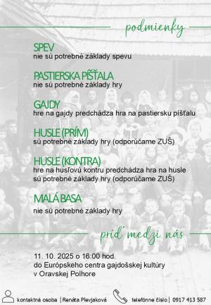 ak máte radi spev, tanec a kroje, pridajte sa do nášho Detského folklórneho súboru Javorina, ktoré sídli v našich priestoroch Európskeho centra gajdošskej kultúry! Nábor detí sa uskutoční už 11. 10. 2025 o 16:00 Európske centrum gajdošskej kultúry, Oravská Polhora
