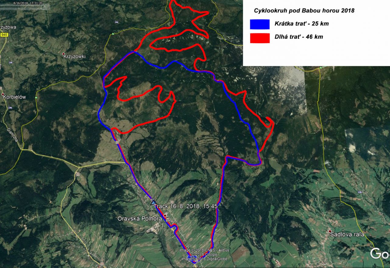 Trasy Cyklookruhu pod Babou horou 2018 - kratšia meria 25 km, tá dlhšia 46 km.