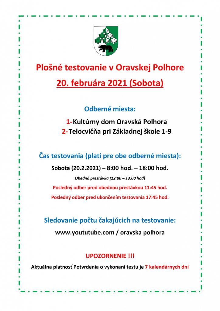 Harmonogram testovania na COVID 19 - 20. februára 2021 (sobota)