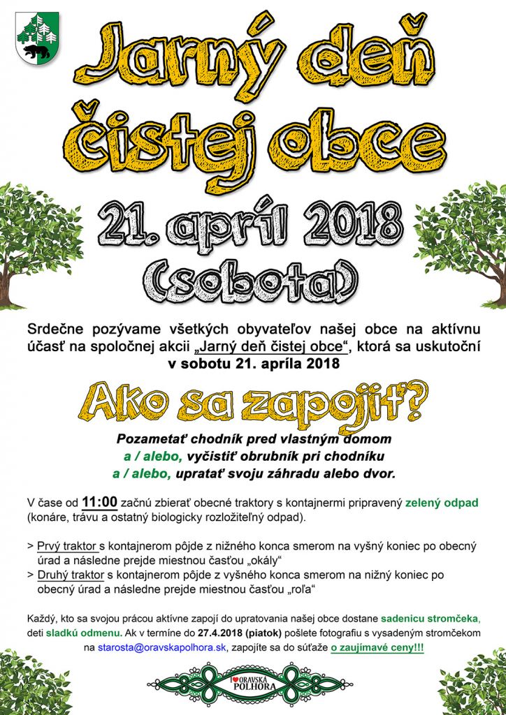 Jarný "upratovací" deň čistej obce. Ani tento rok nezaháľame! Už túto sobotu 21. apríla 2018 budeme opäť spoločne upratovať naše záhrady, zametať chodníky a skrášľovať našu obec. A samozrejme hrať o zaujímavé ceny!