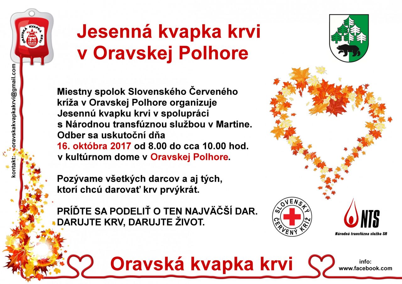 Jesenná kvapka krvi v Oravskej Polhore! Odber sa uskutoční 16.10.2017 o 8:00 v priestoroch Kultúrneho domu.