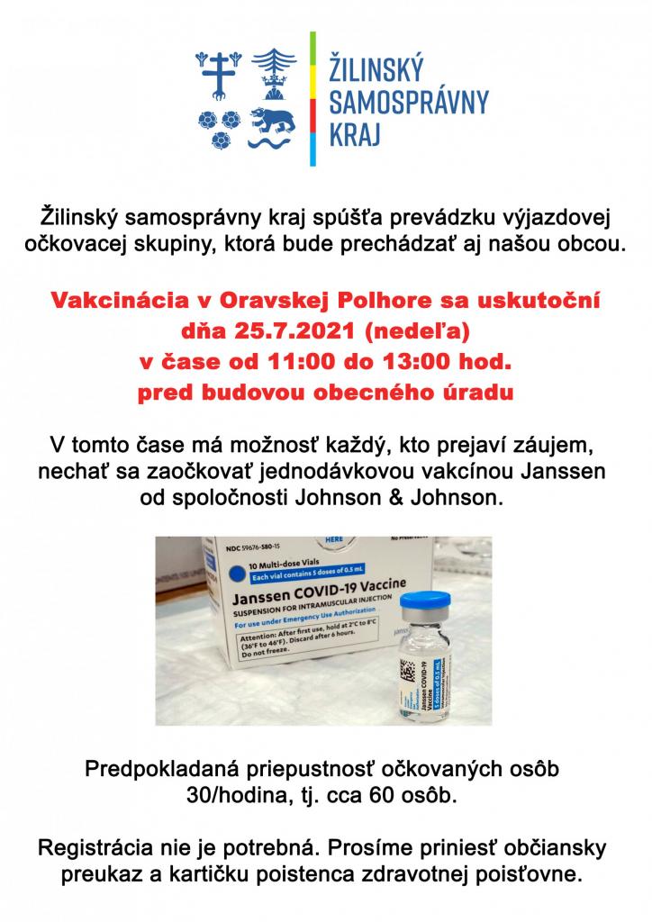ŽSK spustilo prevádzku výjazdovej očkovacej skupiny, ktorá bude prechádzať našou obcou, dňa 25.7.2021 (nedeľa) v čase od 11:00 - 13:00 hod. Využite možnosť zaočkovať jednodávkovou vakcínou Janssen od spoločnosti Johnson & Johnson.