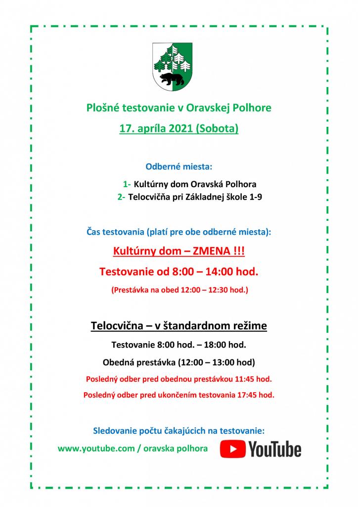 Upozornenie - v prípade odberného miesta v Kultúrnom dome bude testovanie prebiehať od 8:00 - 14:00 hod. Testovanie v telocvični bude štandardne od 8:00 - 18:00 hod.