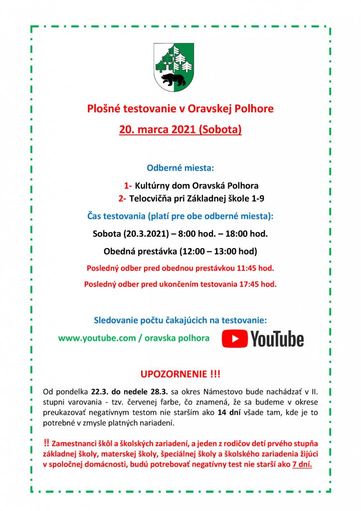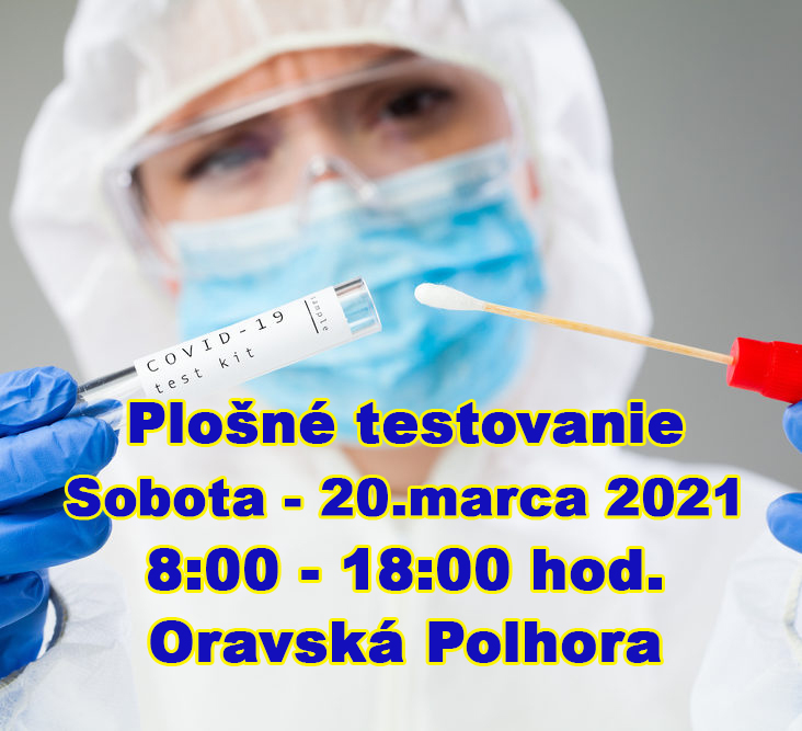 Najbližšie testovanie COVID-19 sa uskutoční v sobotu 20.3.2021 od 8:00 - 18:00 hod. tradične na dvoch odberných miestach.