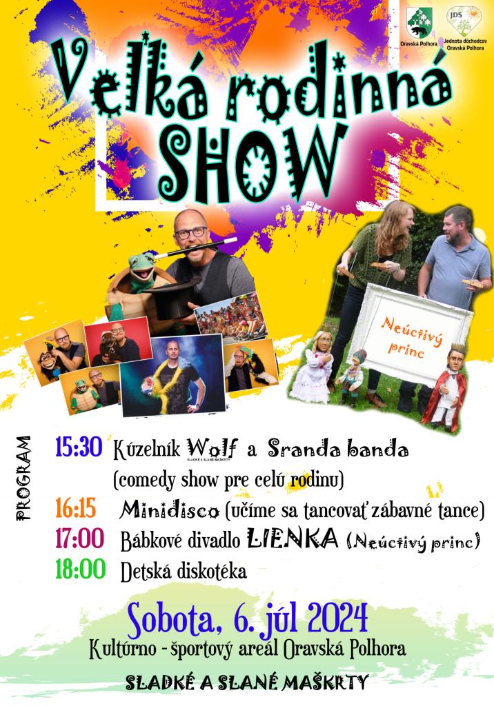 V sobotu, 6. júla 2024 nás čaká VEĽKÁ RODINNÁ SHOW. Okrem bohatého programu sa môžete tešiť aj na Ručne poháňaný drevený kolotoč pre najmenších; Drevený svet hračiek pre chlapcov aj dievčatá; Nafukovacie hrady; Chodule, Maľovanie na tvár.