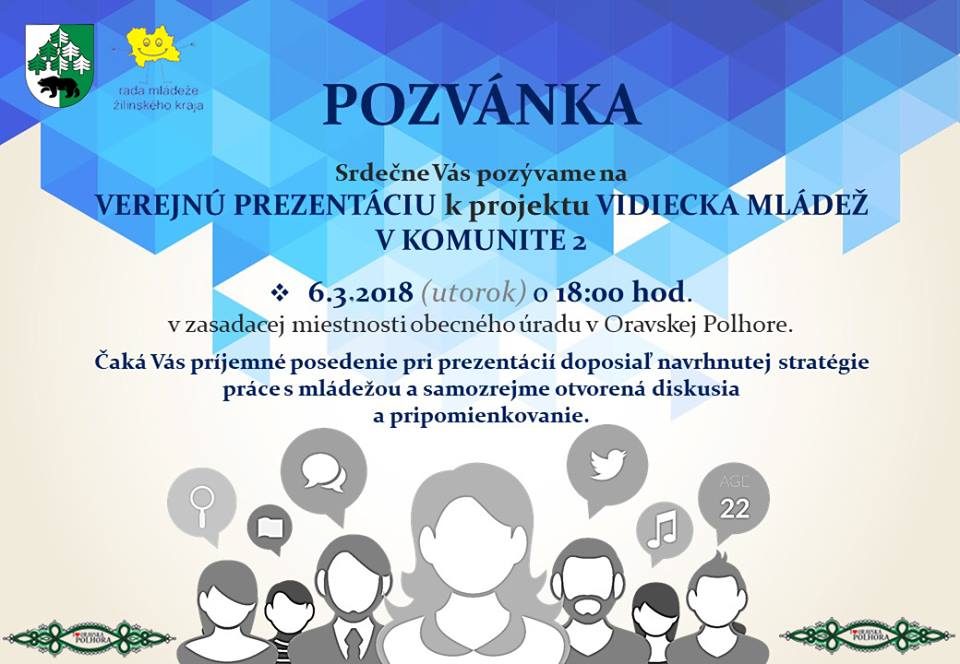 POZVÁNKA - verejná prezentácia prvotných výstupov pripravovanej stratégie práce s mládežou. Utorok, 6.3.2018 o 18:00 hod. v zasadačke obecného úradu v Oravskej Polhore. Všetci ste srdečne pozvaní!
