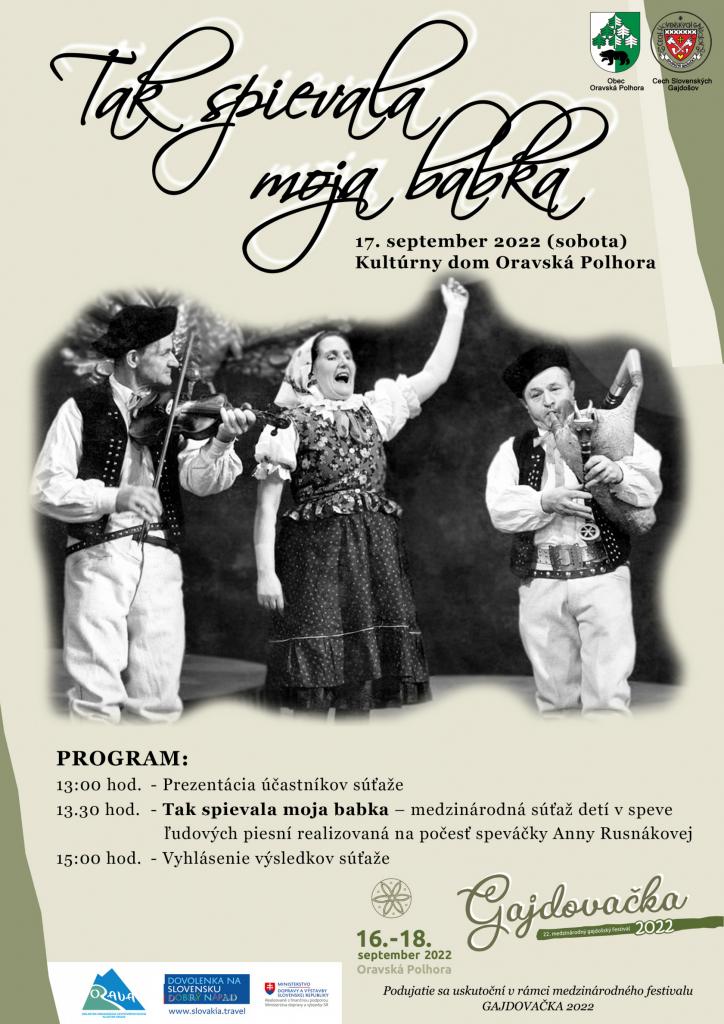 Súťaž v speve tradičných ľudových piesní, ako súčasť sprievodných podujatí medzinárodného festivalu GAJDOVAČKA. Súťaž sa uskutoční v sobotu 17.9.2022, so začiatkom o 13.30 hod. v Kultúrnom dome Oravská Polhora. Na prihlásenie do súťaže je potrebné vyplniť elektronický formulár.